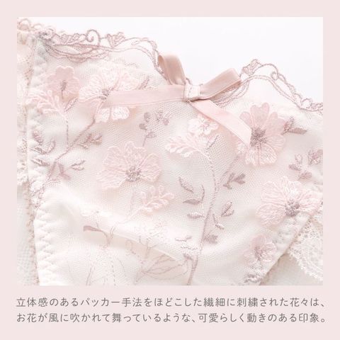 野に咲く花々を立体的に咲かせた、可憐なデザインの「ラーレ」コレクション。立体感のあるパッカー手法をほどこした、繊細に刺繍された花々は、可愛らしく動きのある印象。まるでお花が風に吹かれて舞っているような、新しい季節の訪れを感じるデザインです。