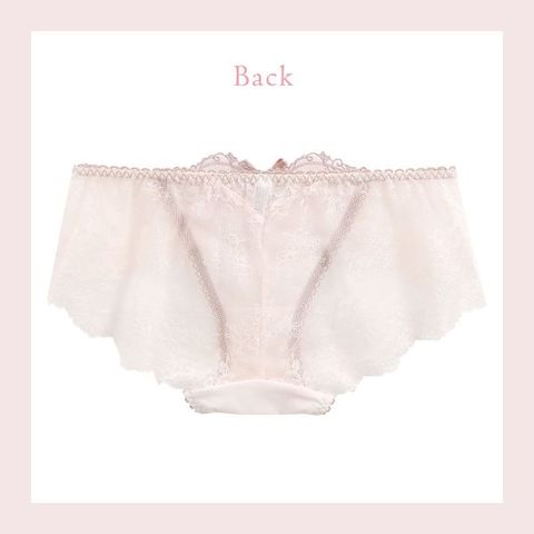 バック全体にレースをあしらったレースショーツ。繊細なレースを使用し、美しい透け感。足口にはゴムを使っていないので食い込まず、少しゆとりをもったはき心地です。伸縮性があるのでほどよくヒップにフィットします。