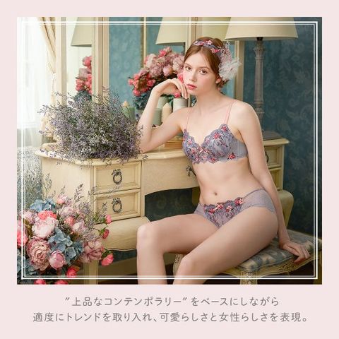 お花が咲きほこるヨーロッパのバルコニーをイメージした「フィオナ」コレクション。レースにはぷっくりとした刺しゅうの小花がふんだんに散りばめられ、バルコニーの格子やアーチを表現した幾何学模様との組み合わせが、とてもフェミニンに仕上がりました。