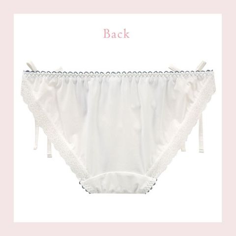サイドがほどけるリボンで、ちょっぴりセクシーなショーツ。バックの身生地は縦横にストレッチ性があり、なめらかな肌ざわりではき心地がいいです。足口はレース付きで華やかに。