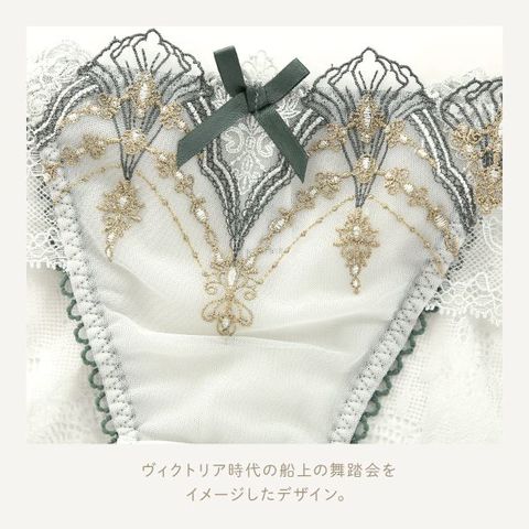 ヴィクトリア時代の船上の舞踏会をイメージしたリサマリレーヌ「シェール」コレクション。当時の象徴でもあるバッスルスカートにほどこされた、ふんだんなフリルモチーフを大胆にデザインしました。フリルを飾るようにあしらわれた輝くラメ糸の刺しゅうは、華やかな貴婦人たちがまとうアクセサリーを表現。ヴィクトリア時代の建造物を連想させる繊細な幾何学模様も組み合わせ、重厚感のある優雅な印象に仕上がりました。