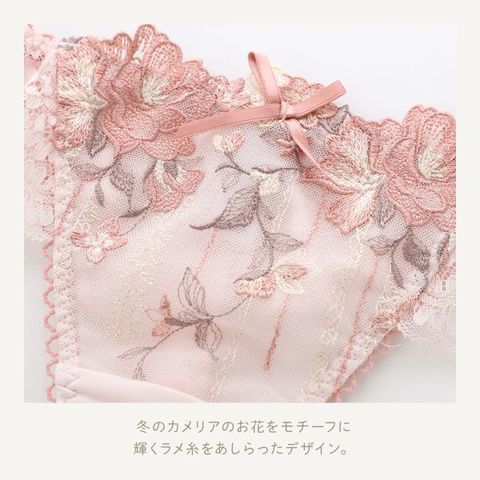 冬のカメリアのお花をモチーフに輝くラメ糸をあしらったリサマリレーヌ「クラシーナ」コレクション。レースにはアクセサリーをモチーフにした様々なチェーン柄をストライプ状に入れることで、お花に動きが生まれ、奥行きを感じられるデザインに仕上がりました。カメリアのお花は立体的な強めのステッチでインパクトをプラス。花びらには部分的に繊細なグラデーションをほどこし、細やかな手法で華やかさを演出しました。