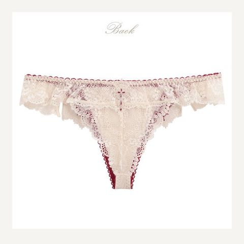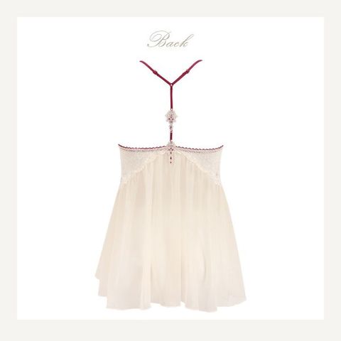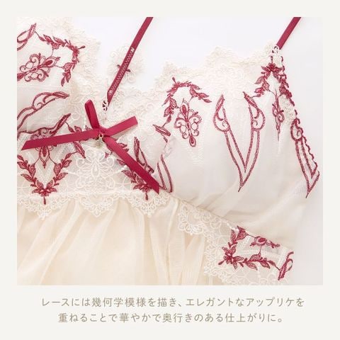 ランジェリーはカップ中央のリボンに揺れるラインストーンを、Y字のバックスタイルにはサーモカットのアップリケをプラス。バスト下にはアシンメトリーにレースをあしらい、クリスマスだけの特別なスタイルに。ショーツは両サイドに小さなスリットとリボンを、バックスタイルにはお揃いのアップリケを添えています。