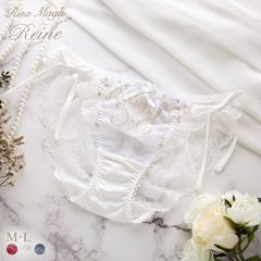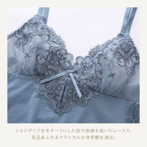 煌びやかな宮殿の装飾をイメージした、リサマリレーヌ「アリーナ」コレクション。シャンデリアをモチーフにした形や曲線を描いたレースで、気品あふれるクラシカルな世界観を演出。全体に輝くラメ糸を刺繍して、繊細にステッチを変化させることで、ワントーンの中にも動きのある印象に。レース上辺には小さなお花をあしらい、さりげない可愛らしさをプラスしています。