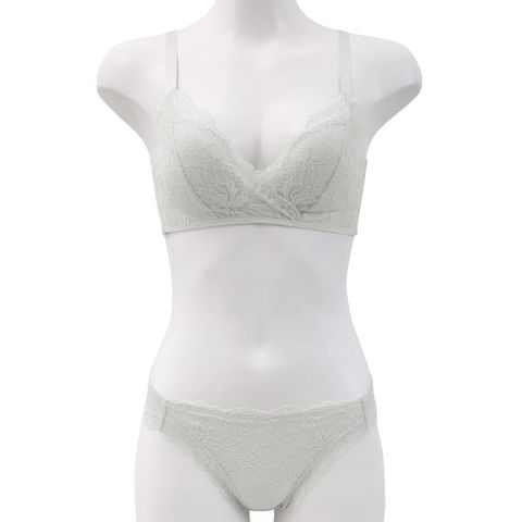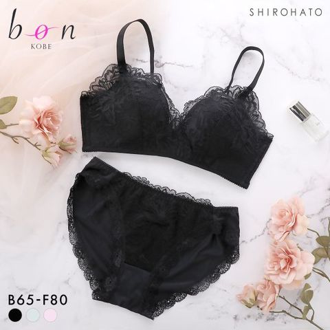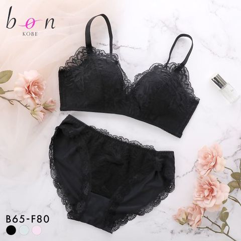 脇高仕様で気になる脇肉をしっかりおさめてくれるビーオーエヌの大人気パターンのシリーズ。繊細なフラワーレースでシンプル可愛い、ノンワイヤーカシュクールタイプのブラショーツセット。