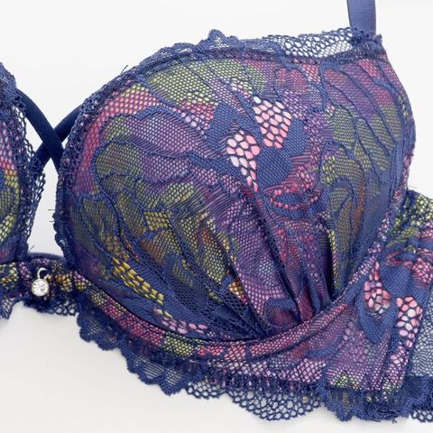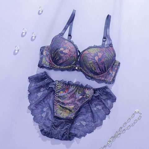 ビビットカラーが華やかなプリント生地に繊細な花柄レースをあわせ、セクシークールに仕上げたブラ&ショーツセット。胸もとにあしらった編み上げ風のクロスコードが胸もとをセクシーに演出します。