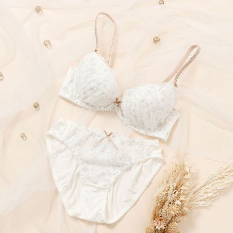 水彩タッチのフラワープリントに、小花の刺繍レースを合わせたふんわり可愛い雰囲気のブラセット。ポイントであしらったラメ糸がさりげなくきらめくフェミニンなデザインです。