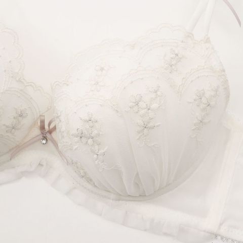 小花の刺繍とカップ土台のフリルでとびきり可愛く仕上げたブラ&ショーツセット♪もこもこ小花刺繍のアウトラインにはラメ糸を使用し、さりげなくきらめく可憐なアクセントに。カップ上部の繊細なアーチレースやストラップにあしらったリボンなどがあまくて可愛らしいディティールです♪