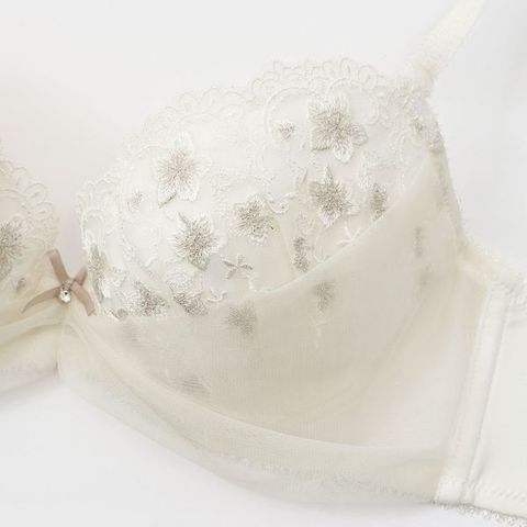 繊細なラメ糸であしらった小花刺しゅうがフェミニンなブラセット。サイドから前中心にふんわりとチュールをあしらい、清楚で可愛らしい雰囲気に。前中心のストーン付きリボンがさりげなくガーリーなアクセントになっています。やわらかなパステルカラーがデイリー使いにぴったりです。