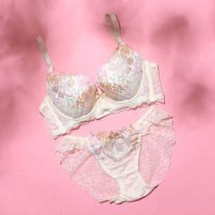 フェミニンな配色の大花刺繍がラグジュアリーなブラジャー&Tバックショーツセット。刺繍にはポイントでシルバーのラメ糸を使用し、きらきら輝いて華やかな印象に。