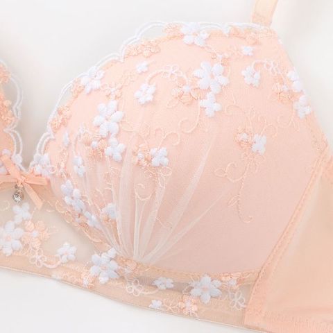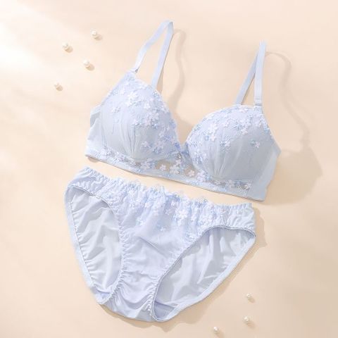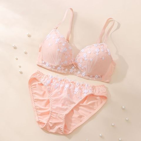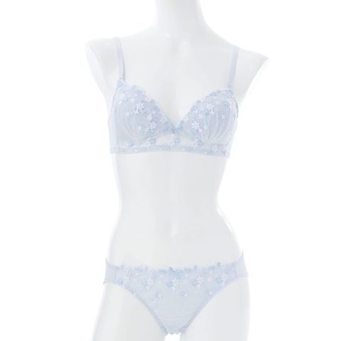 白い小花の刺繍が清楚で可愛いノンワイヤーブラ&ショーツセット♪淡いパステルカラーのやさしい色合いに、ふわっと立体的な刺繍をあしらってガーリーな雰囲気に仕上げました。フロントのストーン付きリボンがポイントです。