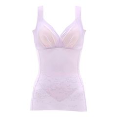 パッドの出し入れができるので、ブラジャーの有り無しどちらでも着用が可能です。カップ脇布でおさえて、バストすっきりシルエットに。脇上辺は折り返し始末でくいこみにくく圧迫感の少ないつけごこちです。