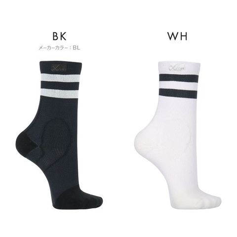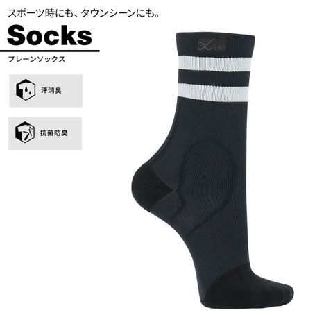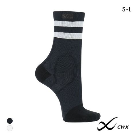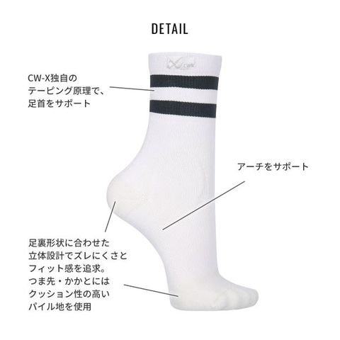 CW-X独自のテーピング原理で、足首と足裏のアーチをサポートし、運動時の足の疲労を軽減。CW-Xのプレーンソックス クルータイプ。