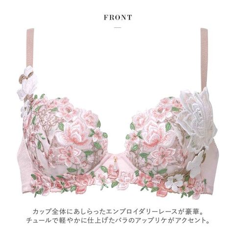 カップにあしらったエンブロイダリーレースが豪華。チュールで軽やかに仕上げたバラのアップリケが愛らしいアクセントになっています。前中心にはパールチャームをそえて、ロマンティックな仕上がり。