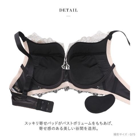 | 仕 様 | ・ホックの数:2段2列 ・3/4カップ ・スッキリ寄せパッド入り(取外し可能) ・肩紐取外し:不可 ・幅広フラットワイヤー入り ・サイドボーン:あり ※サイズによっては柄の位置やデザインが異なる場合がございます。 ※商品によって柄の出方が異なる場合がございます。 |