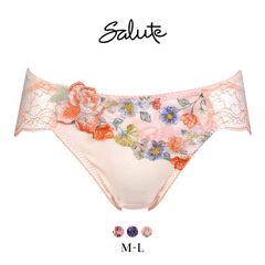 オンプリント手法の小花を散りばめたレースの奥には、大きなバラのアップリケを潜ませて、サルートならではの奥行き感のある美しさ。ブラの下辺を飾る幾何学柄のレースが、谷間のくっきり感を視覚的に強調。