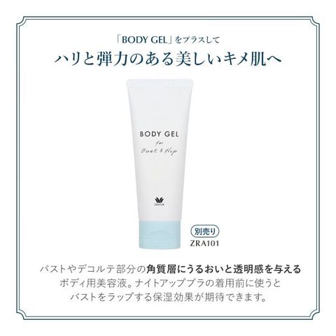 カップ内側にサポートシートを内蔵し、就寝中やくつろぎ時、立位でのバストを包みこむようにささえて脇流れを防ぎます。伸縮性があり体にほどよくフィットし、締め付け感がなく軽い着け心地です。適正な位置でバストをラクに安定させるので、睡眠時のバストの不快感や不安定感が少なくなり、心地よい眠りに。