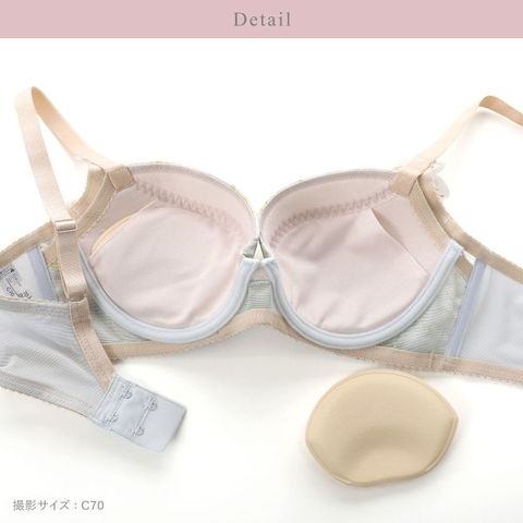 「脇高設計」により脇布を広くとって気になる脇肉をしっかりカバーし、サイドラインをすっきり整えます。バスト周辺のはみ出たお肉をまとめて、デコルテをふっくらボリュームアップ。カップ裏には、取り外し可能なパッド付きです。