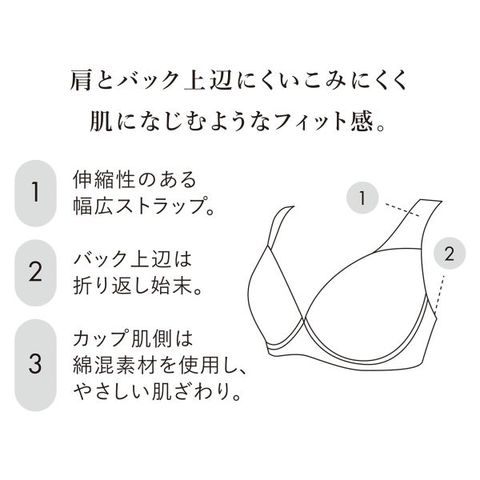 肩とバック上辺にくいこみにくく肌になじむようなフィット感。【ナチュラルメイクブラ フルカップ<ラクにフィット>】です。