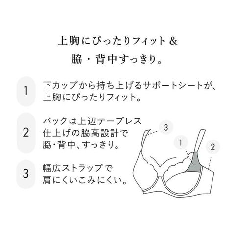 安心感のある4/5カップでオトナの胸にぴったりフィット。下カップから持ち上げるサポートシートが、上胸をぴったりフィットさせ脇すっきりシルエットに。