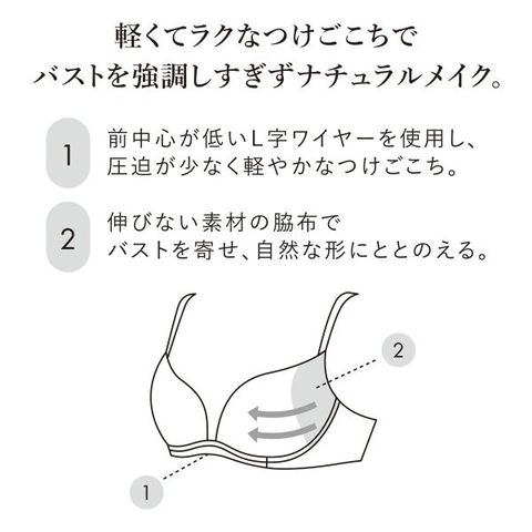 前中心の低いL字ワイヤーを使用し、フロント部分の圧迫が少なく、バックの締め付けも少ない軽やかな着用感。