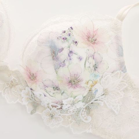 春の訪れを感じるような華やかで彩りのあるプリントと、ラメ糸のチュールエンブロイダリーレースが美しいデザイン。アンダー部分には草花モチーフのケミカルアップリケに花を描いたチュールエンブロイダリーアップリケの立体加工がされ、特別感のあるデザインに仕上げました。