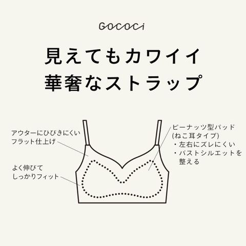 立体感と厚みのある左右一体型のピーナッツ型パッド(ねこ耳タイプ)入りで、上向きで立体的なバストシルエットでありながら、バストトップ間隔が離れず位置が安定。パッドの上辺が上胸に沿いやすいラインになっているので、横胸のシルエットをきれいにしてくれます。