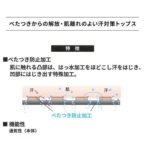 肌に触れる凸部は撥水加工をほどこし汗をはじき、凹部にはじき出す特殊加工で、べたつきを防止。