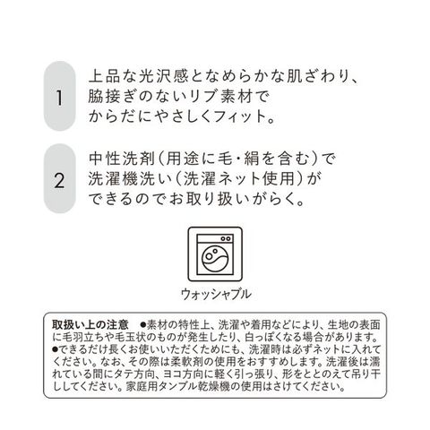 上品な光沢感でなめらかな肌ざわり。脇接ぎのないリブ素材でやさしい肌あたりです。ネックは光沢のある縫製糸を使用したアウターライクな縫製仕様です。