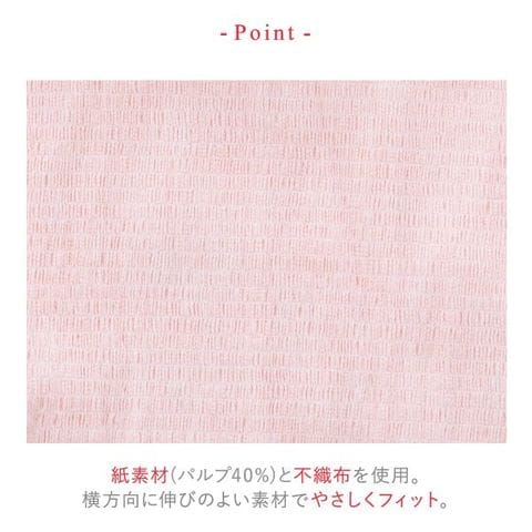 紙素材(パルプ40%)と不織布を使用した1回着用の使いきりタイプ。横方向に伸びのよい素材でやさしくフィットし、M-LLまでワンサイズで対応します。テープ類を使用していないので、圧迫感を軽減しラクな着用感です。