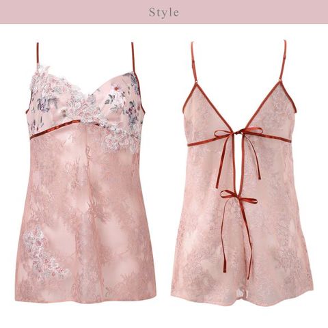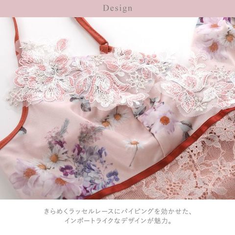きらめくラッセルレースにパイピングを効かせた、インポートライクなデザインが魅力。シアーな薔薇のアップリケが美しく上品なアクセントに。コーディネート着用すると、さらにラグジュアリーで洗練された雰囲気を楽しめます。