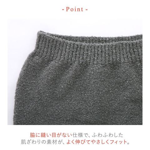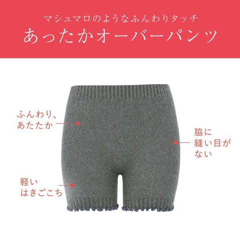 マシュマロ糸を使いふんわり編み上げたあったかパンツ。脇に縫い目がない仕様で、ふわふわした肌ざわりの素材が、よく伸びてやさしくフィット。おなかもヒップもすっぽり、やさしいぬくもりでつつみます。