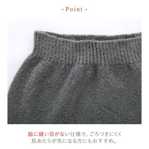 やわらかなマシュマロ糸を使いふんわり厚手に編み上げたあったかインナー。脇に縫い目がない仕様で、ごろつきにくく肌あたりが気になる方にもおすすめ。ウエストから足首まですっぽり、ふんわりやさしいぬくもりで包み込みます。