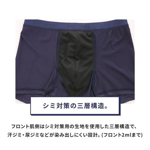 フロント肌側はシミ対策用の生地を使用した三層構造になっており、汗ジミ・尿ジミなどが染み出しにくい設計になっています。(フロント2mlまで)