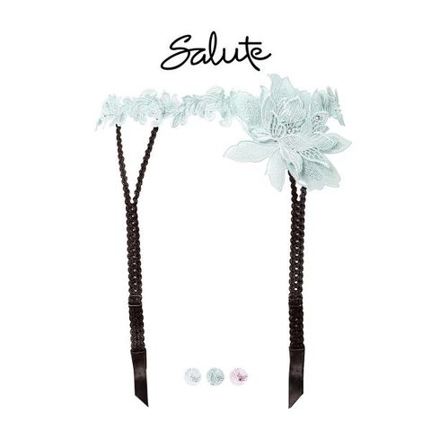 美しいレースでウエストを飾るラグジュアリーなガーターベルト。シンプルなカラーリングが繊細なレースをより引き立てます。アカンサス文様をあしらったバラのアップリケには上品に輝くスワロフスキー・クリスタルを添えました。バックのストラップ部分にほどこされた羽根モチーフがさりげないアクセントに。
