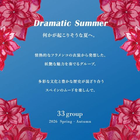 何かが起こりそうな夏へ。情熱的なフラメンコの衣装から発想した、妖艶な魅力を奏でるグループ。多彩な文化と豊かな歴史が混ざり合うスペインのムードを楽しんで。