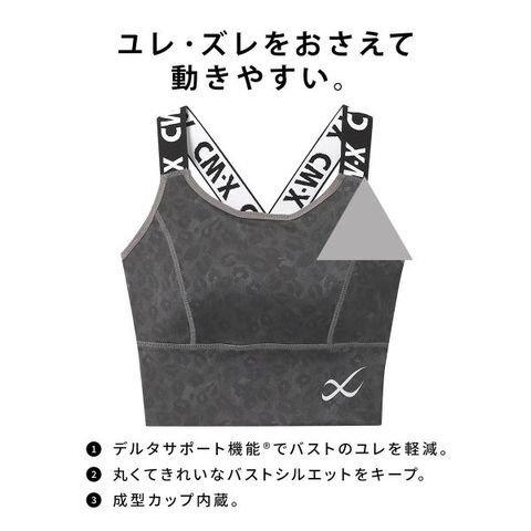 デルタサポート機能でバストのユレを軽減。自然な丸みのウレタン成型カップで、丸くてきれいなバストシルエットをキープします。カラダになじみやすいクロスバックになったストラップにはロゴ入りでアウターからのぞかせても◎
