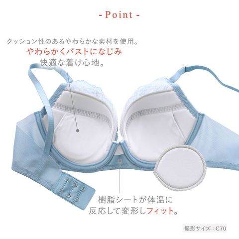カップの間の前中心にしのばせた樹脂シートが体温に反応して変形し、バストの左右差や個々の体型に合わせてここちよくフィットします。
