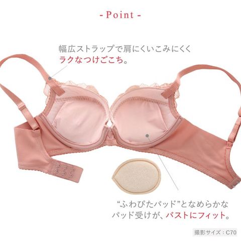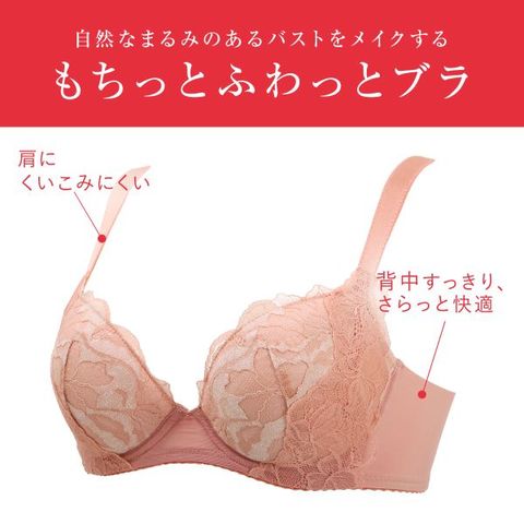 もちっとふんわり触感と、しっとりすべすべな肌ざわりが心地よく、自然なまるみのあるバストをメイクするブラジャー。「ふわぴたパッド」となめらか素材のパッド受けがバストにフィットして、とろけるような着用感です。