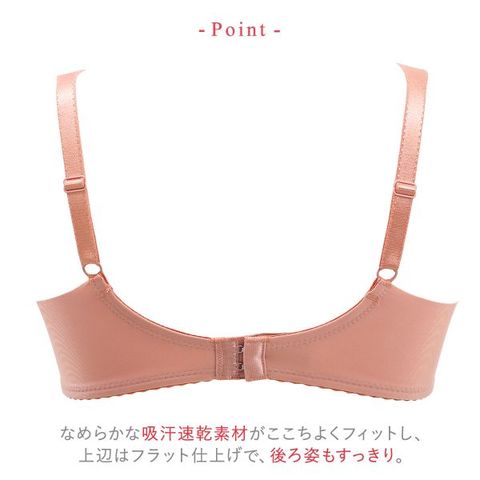 ストラップは幅広タイプなのでズレにくく、肩にくいこみにくいのでラクな着け心地。バックはタテヨコにしなやかに伸びる、なめらかな吸汗速乾素材がここちよくフィット。上辺はフラット仕上げで背中の段差を軽減し、後ろ姿もすっきり。