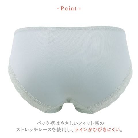 フロントは裏打ちつきで透けにくく、やさしい肌あたり。ウエストと前裾に高伸度のテープを使用し、ウエストや足の付け根のしめつけ感を軽減してやさしくフィット。バック裾はくいこみにくく、アウターにひびきにくいストレッチレース仕上げです。
