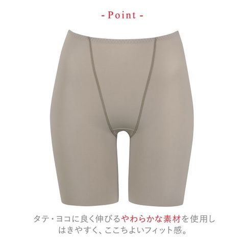 伸びのよい身生地でおしりをすっぽり包みこみ、ほどよいサポート力でヒップアップ。身生地のパワーによりおなか部分もほどよく押さえます。後ろ中心ゴムがヒップを引き上げ、ギャザーを加えてきれいなまるみをキープします。