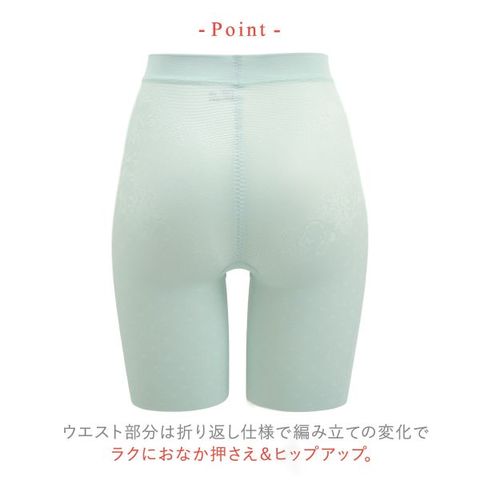 ウエスト部分はくいこみにくい折り返し仕様で、編み立ての変化で無理なくラクにおなか押さえ&ヒップアップ。ラクなのにすっきりシルエットをメイクします。