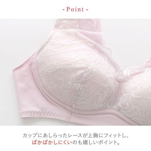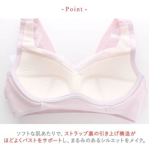 ソフトな肌あたりで、ストラップ裏の引き上げ構造がほどよくバストをサポートし、まるみのあるシルエットをメイク。カップにあしらったレースが上胸にフィットし、ぱかぱかしにくいのも嬉しいポイント。しめつけが少なく、ラクな着け心地です。
