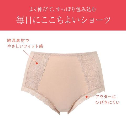 毎日のショーツとして使いやすいシンプルなデザイン。身生地は伸びの良いソフトな綿混素材でフィット感があり、安心感のある履き心地です。