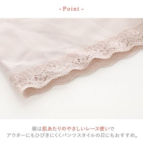 身生地部はやわらかな肌ざわりの綿混素材を使い、フロント中央にあしらったあて布でおなかをやさしくサポートします。裾は肌あたりのやさしいレース使いでアウターにひびきにくくパンツスタイルの日にもおすすめ。太ももまでカバーするロング丈なので、ヒップラインもすっきり。
