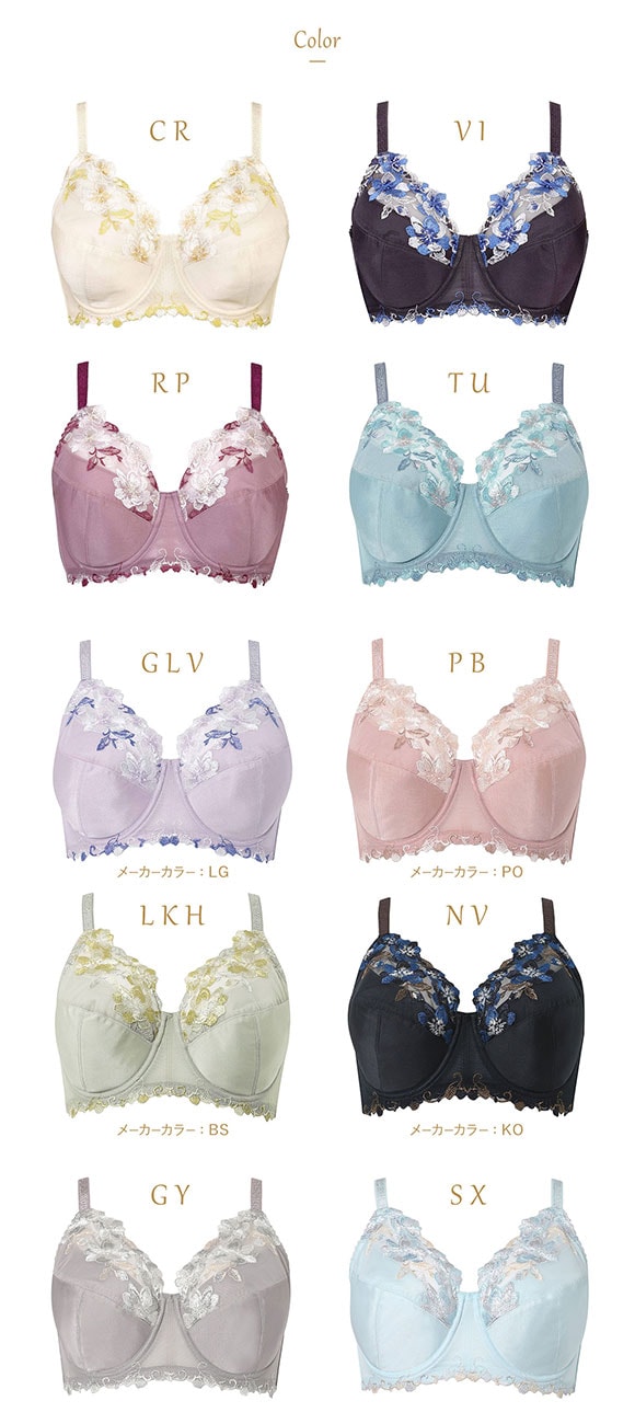 フルカップの安定感に上品で華やかな彩りをそえて。胸もとに咲き誇る刺繍レースの花々が上品で華やかなフルカップブラジャー。