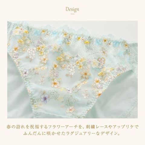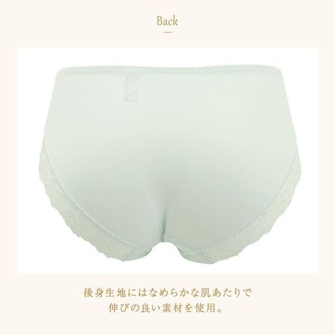 フロントは裏打ちつきで透けにくく、やさしい肌あたり。バック裾は繊細なストレッチレースで、アウターにひびきにくく、ほどよいフィット感に。華やぎもリラックスも満たされたい日におすすめです。