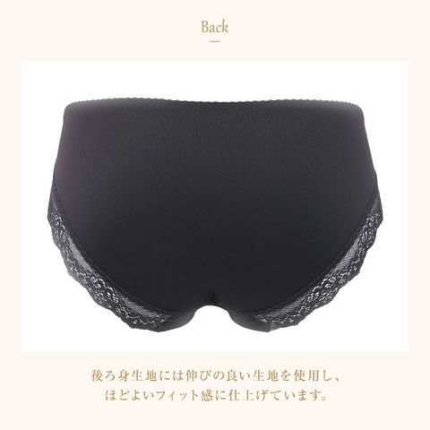 後ろ身生地には伸びの良い素材を使用し、ほどよいフィット感に仕上げています。フロントは裏打ちつきで透けにくく、やさしい肌あたり。後ろ裾はくいこみにくく、アウターにひびきにくいストレッチレース仕上げです。