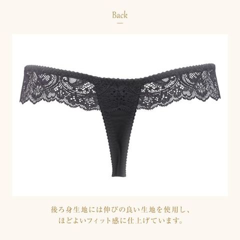 | 仕 様 | ・伸縮性:バックのみ縦横にあり ・クロッチ:付き ・透感:レース部分にあり(フロント裏打ち付き) ・はきこみ丈:あさめ |